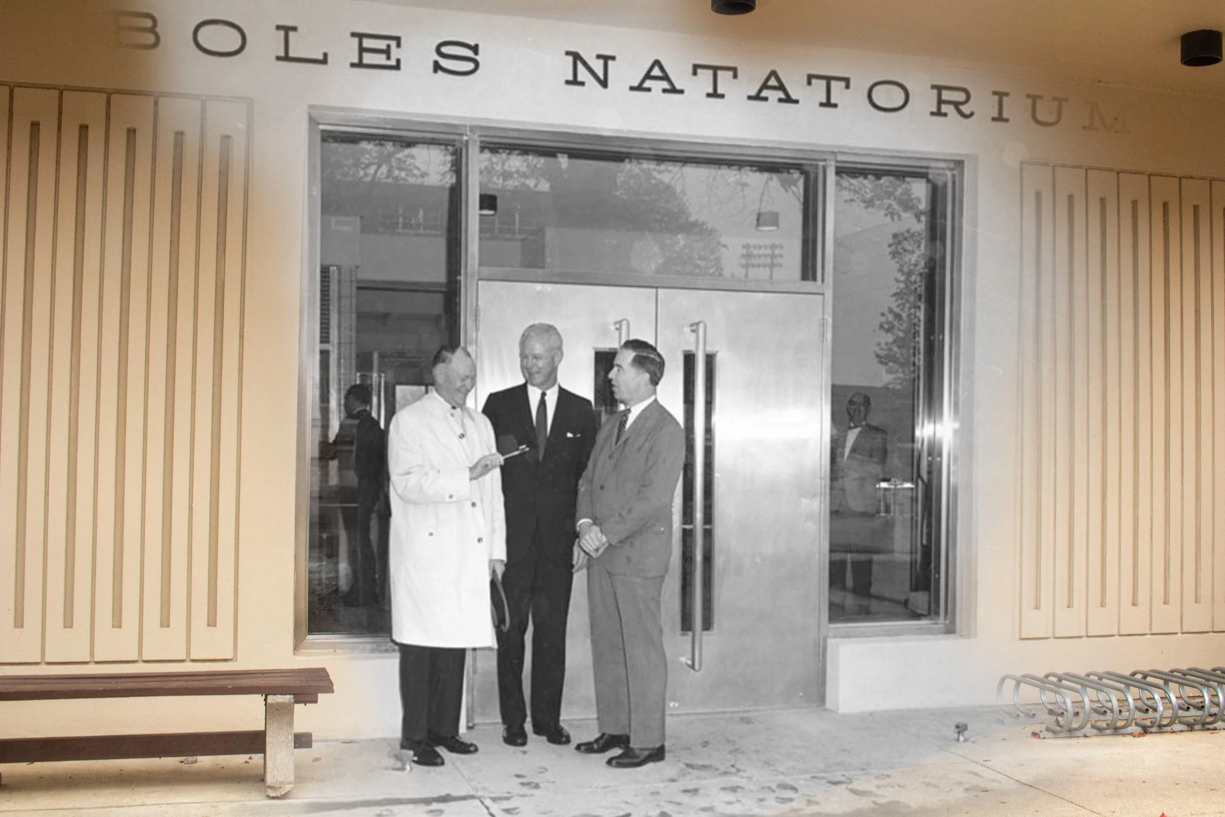 Ewing T. Boles, Bud Wilkinson, and Thomas Spragens standing outside Boles Natatorium during the dedication ceremony, April 27, 1968 / Boles Natatorium, December 2023.