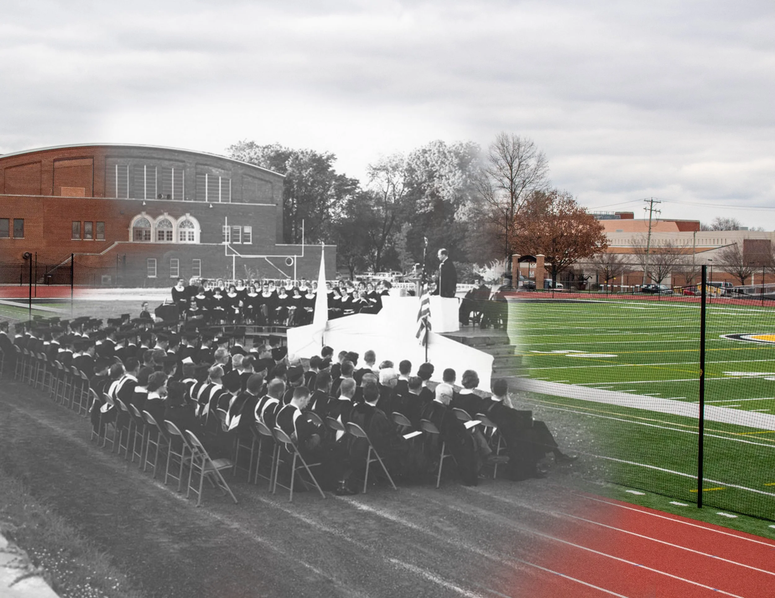 Centre College’s 1961 Commencement / View of Sutcliffe Hall and the football field, December 2023